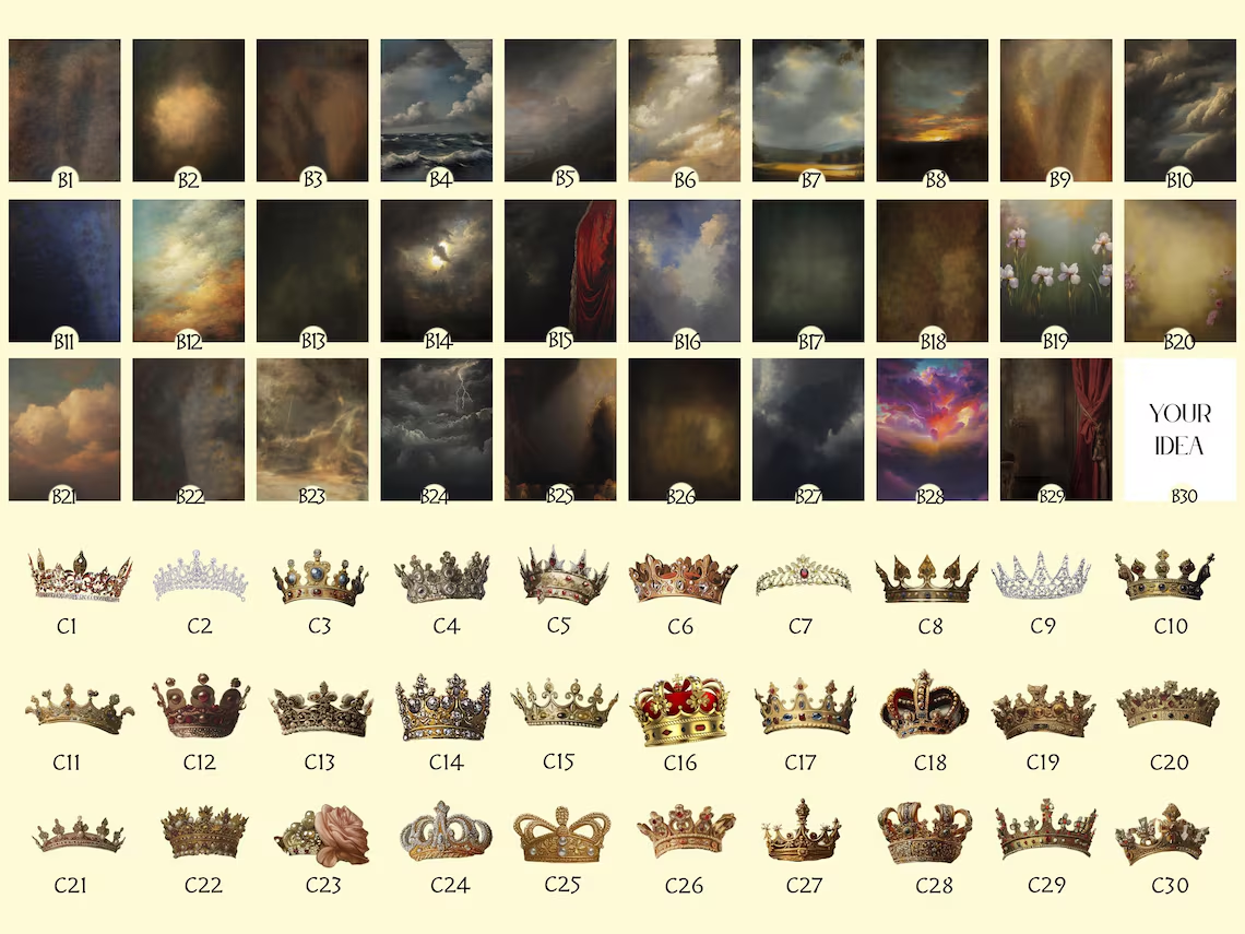 In this listing, you have a wide array of options at your fingertips, including pet portraits for male and female pets, pet and owner portraits, modern pet portraits, and even exquisite Renaissance-era portraits. What's more, you have the creative freedom to select your desired background and crowns, allowing you to customize each portrait to your unique preferences.